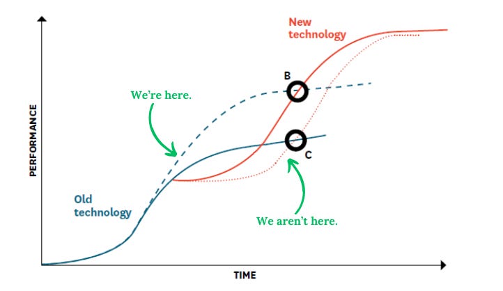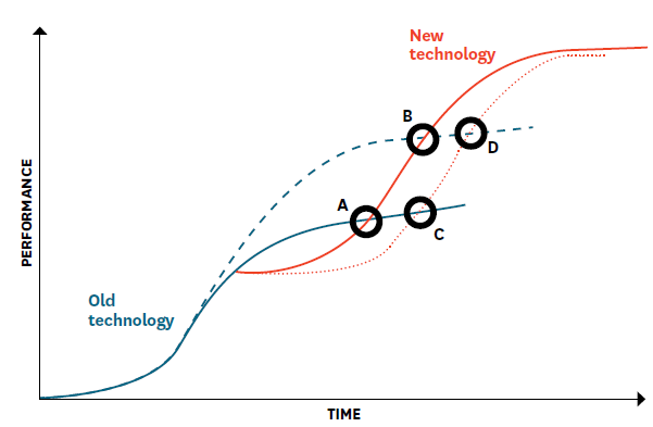 A2016 article called Right Tech, Wrong Time in the Harvard Business Review neatly outlines scenarios when tech reaches inflection points — the moment when we jump from the existing S curve to the next one. There are four scenarios that describe how that may happen: