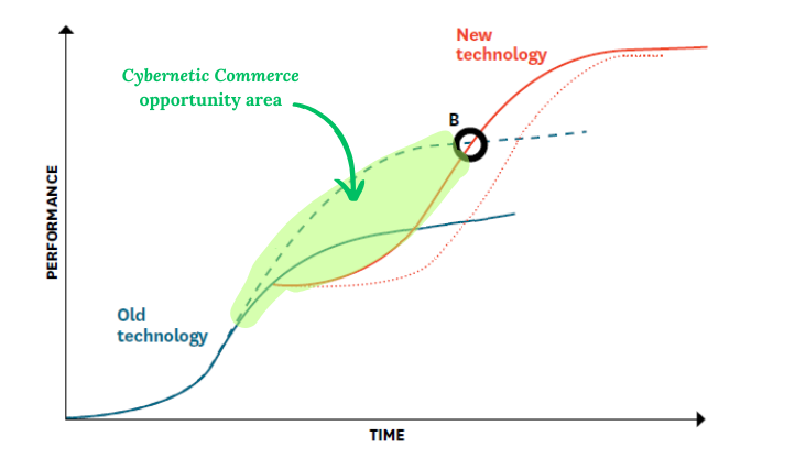 Point B: Old tech can still improve, and the market is ready for new tech, causing a slower transition (e.g., hybrid cars to electric vehicles).