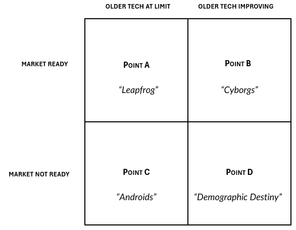 Point A: Old tech can’t improve, and the market is ready for new tech, leading to rapid adoption (e.g., Blackberry to iPhone).