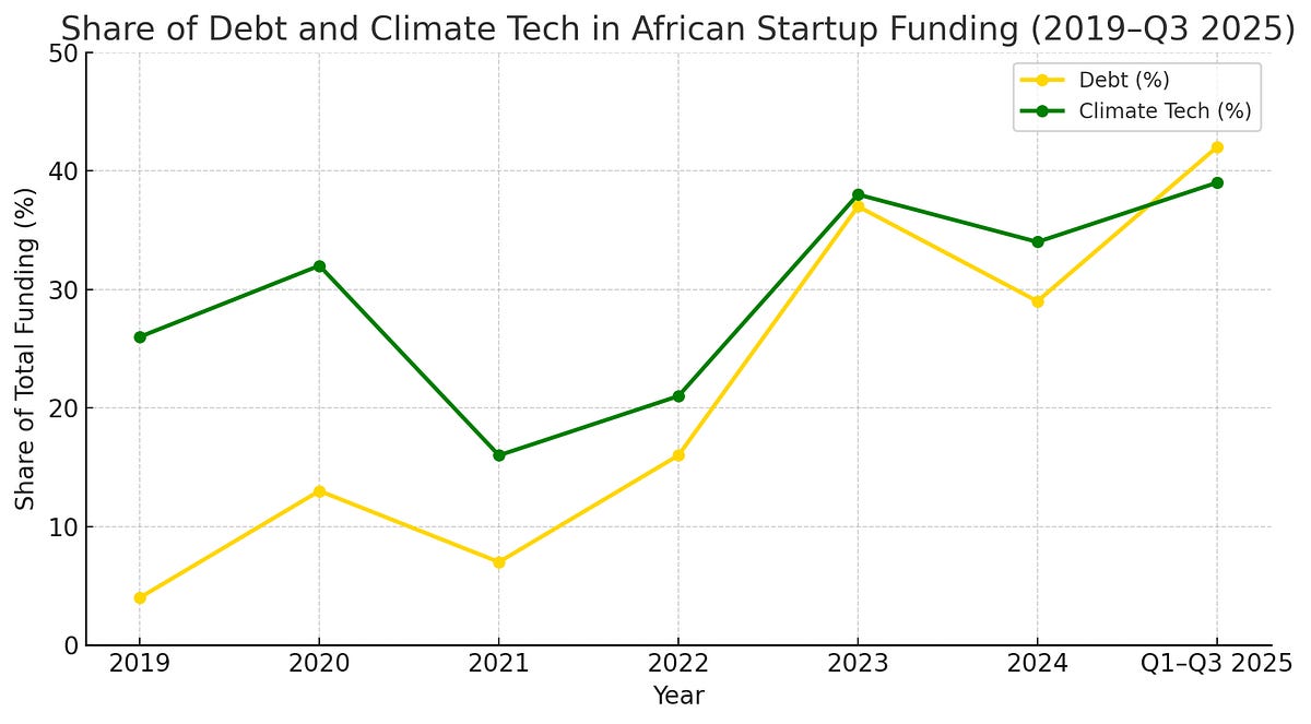 Full year African venture funding numbers have been released. Debt ended 2025 at 37% of total funding and climate tech at 38% of total funding according to Africa: The Big Deal.